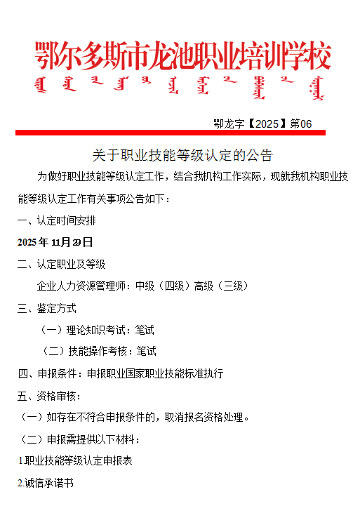 2025年11月29日龙池职业培训学校第4批认定 职业技能等级认定公告